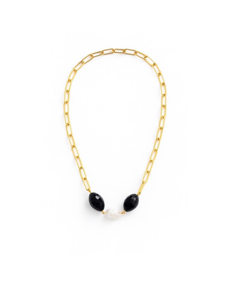 Precioso collar hecho con cadena larga , es elegante y atemporal , dos Ágatas negras y una perla barroca son la pieza central .