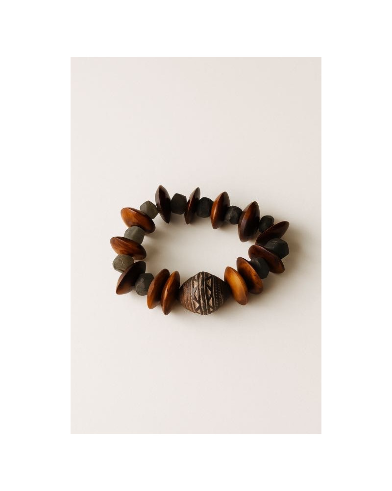 Cuentas madera Africa, Cristal en bruto negro y cuenta central de cerámica Africana, lleva goma por lo que se adapta a cualquier muñeca